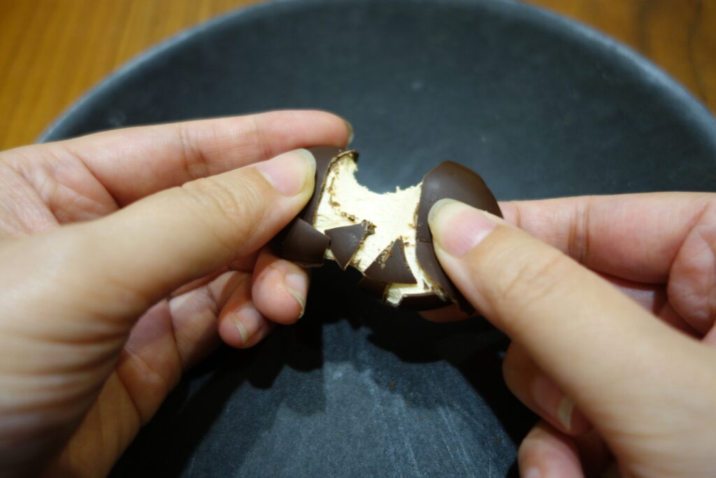 肝心の味ですが、外のチョコはパキパキ。中のマシュマロはもちもちパッションの味。